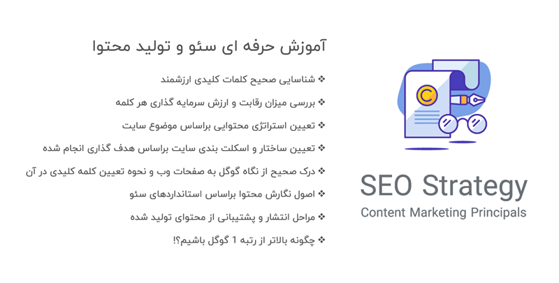 برای کسب نتایج بهتر نیازمند آنالیز رقبا، تدوین استراتژی محتوایی، تعیین ساختار سایت (صفحات لندینگ برای هر کلمه)، شناخت الگوریتم های گوگل و البته نگارش صحیح محتوا مطابق با استانداردهای مفهوم گرایی هستیم. مسیر تدوین استراتژی و نگارش محتوای مفهومی در کارگاه آموزش حرفه ای سئو و تولید محتوا به صورت کامل بررسی و آموزش داده میشود.